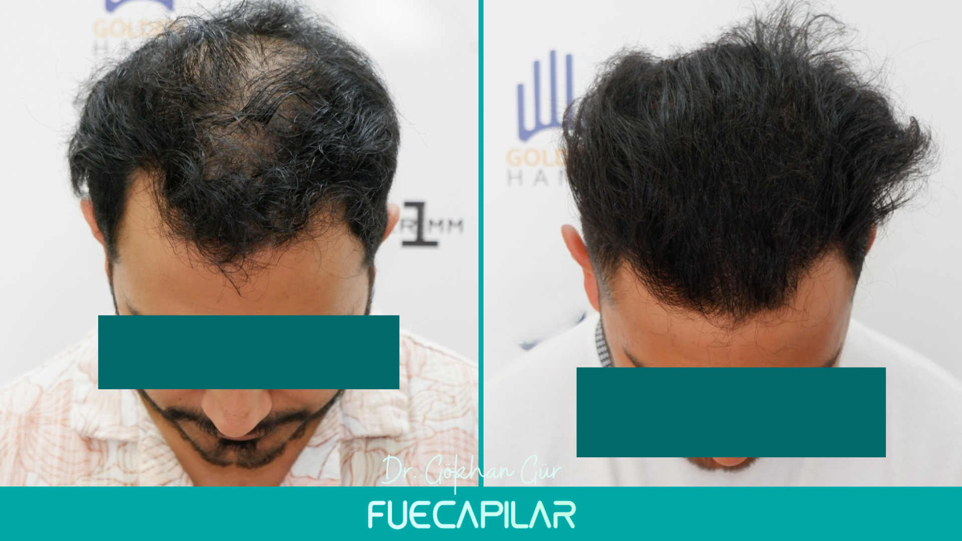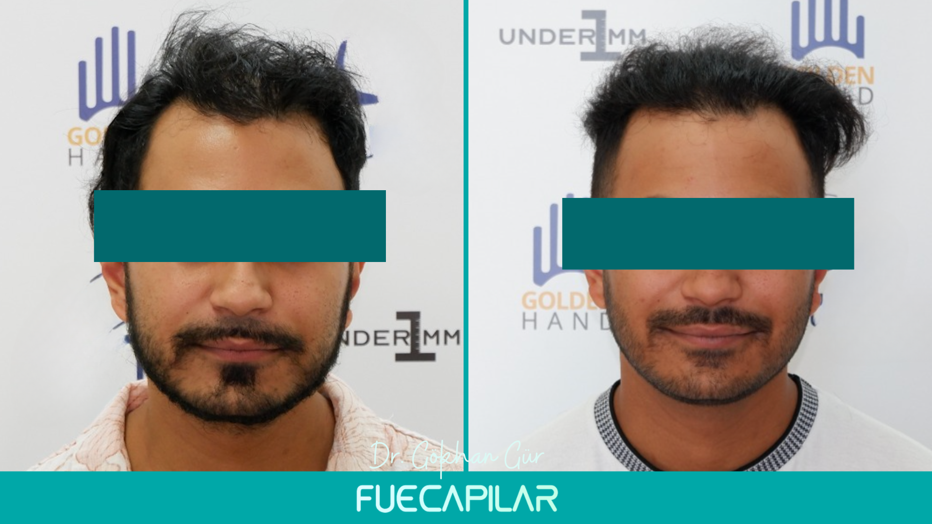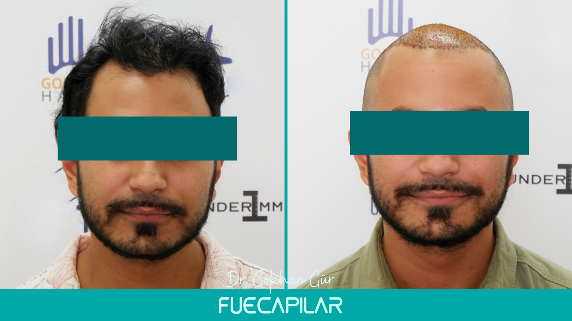 Plan Quirúrgico: Reconstrucción de la línea de entradas, aumento de densidad en la zona frontal, frontotemporal, zona media y coronilla. La cirugía se realizó en un día. Se implantaron un total de 3156 injertos: 200 injertos individuales en la línea de entradas, 1156 en la zona frontal y el resto en la zona media y coronilla