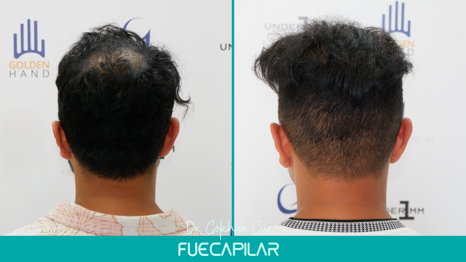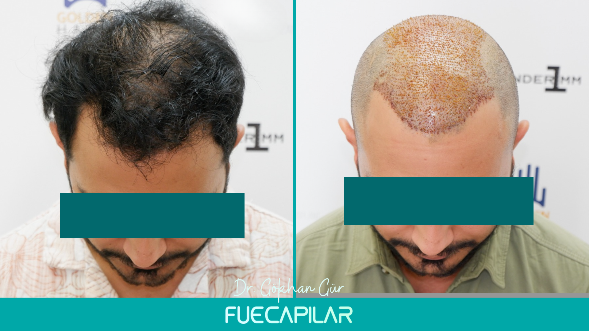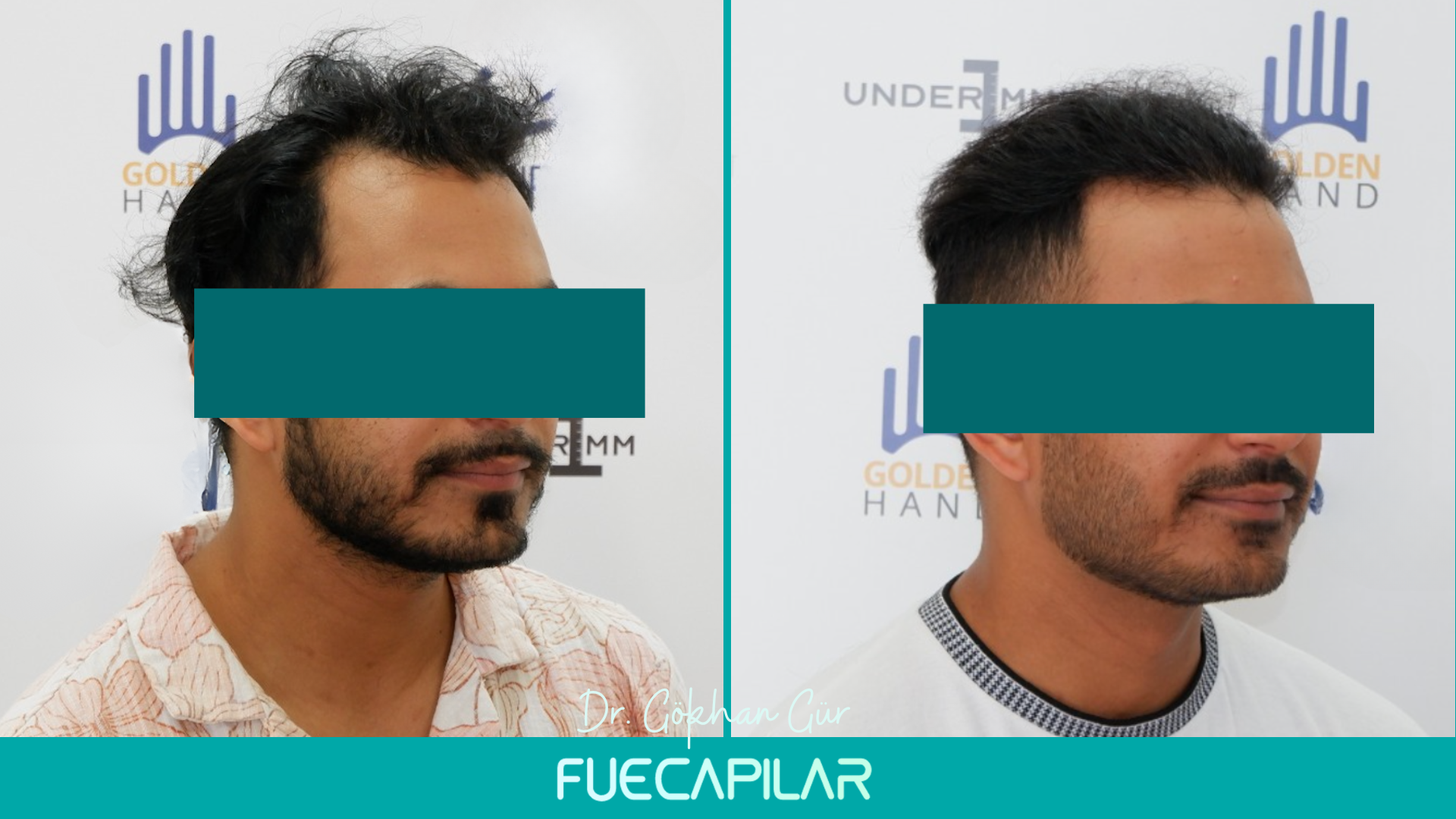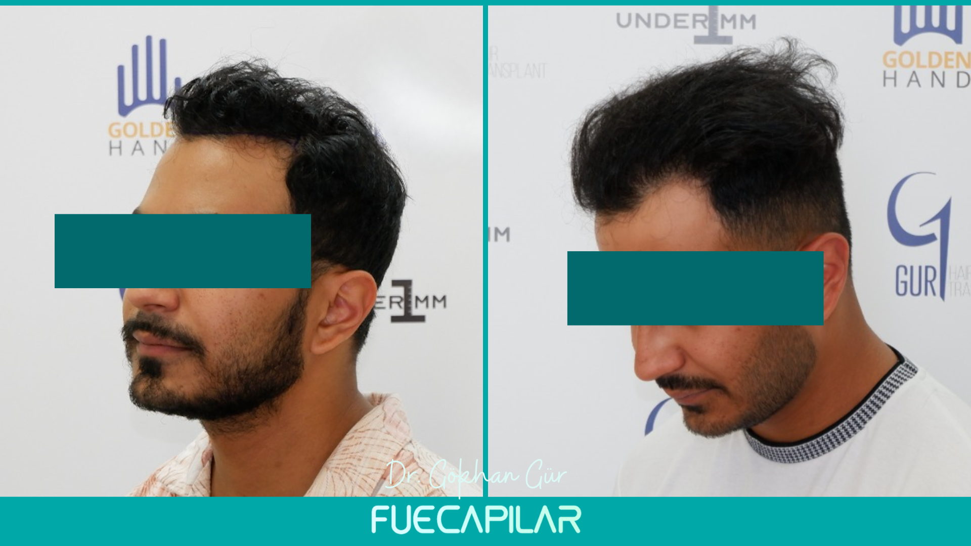Plan Quirúrgico: Reconstrucción de la línea de entradas, aumento de densidad en la zona frontal, frontotemporal, zona media y coronilla. La cirugía se realizó en un día. Se implantaron un total de 3156 injertos: 200 injertos individuales en la línea de entradas, 1156 en la zona frontal y el resto en la zona media y coronilla